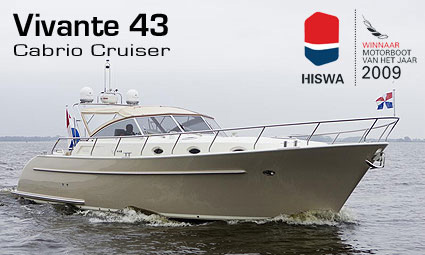 Ook de Hiswa motorboot van het jaar 2009 Vivante 43 is uitgerust met telescopische spudpalen van Hollandia.
